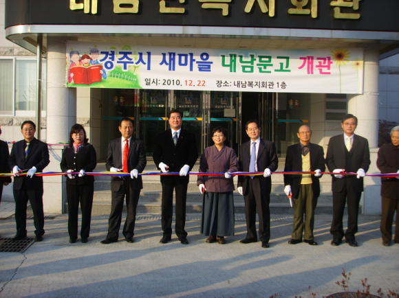 경주시새마을회(회장 임영식), 새마을문고경주시지부(회장 이순득)에서는 2010년 12월 22일(수) 15:00 경주시 내남면 면민복지회관 1층 교육장에 내남면 새마을문고(회장 서윤이) 작은 도서관을 개관했다.