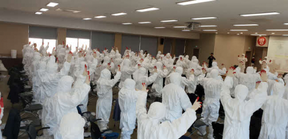 최근 특별방역대책기간(18.10.1 ~ 19.2.28)이 실시됨에 따라 안전하고 정확한 방역업무 수행을 위해, 방역활동 수행 시 인체감염 예방·행동지침·조치사항 등을 살처분 및 매몰작업 동원 인원 120명에게 교육하였다.