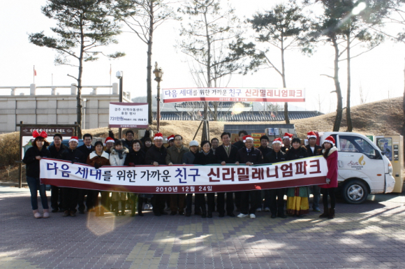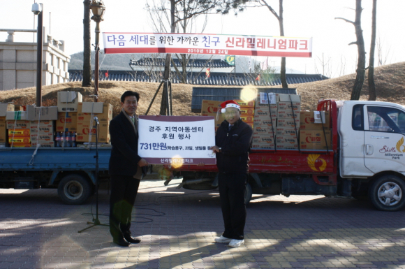 신라밀레니엄파크는 연말연시를 앞둔 12월 24일(금) 경주 ‘지역아동센터’ 10곳을 방문하여 700만원 상당의 학습용구과 생필품 등을 전달하고 지역아동센터를 이용하는 300여명의 학생들과 따뜻한 세밑 행사를 가졌다.