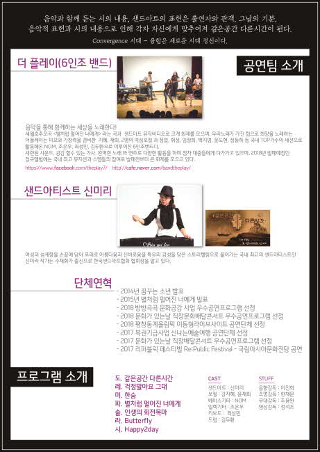 예주문화예술회관 관계자는 “이번 공연은 시를 노래와 연주, 음악으로 풀어내 누구나 쉽게 접근할 수 있는 공연이 될 것이다. 국내 최고 뮤지션인 더 플레이(6인조밴드)와 샌드아티스트 신미리의 콜라보레이션 공연을 많은 분들이 관람하길 바란다.”고 전했다. |