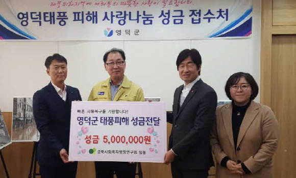 경상북도 사회복지행정연구회(회장 임재춘)에서는 태풍 ‘콩레이’로 큰 피해를 입은 주민들의 복구지원을 위하여 지난 10월 30일 회장을 비롯한 임원2명이 함께 영덕군을 방문하여 하성찬 부군수에게 성금 500만원을 전달했다.