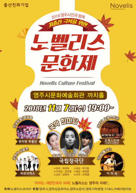 5일 영주시에 따르면 일․가정 양립 사회 분위기 조성과 출산친화적인 기업문화 조성을 위해 노벨리스코리아 영주공장이 주최하는 ‘영주시민과 함께 저출생 극복을 위한 노벨리스 문화제’가 11월 7일 저녁7시 영주문화예술회관 까치홀에서 개최된다.