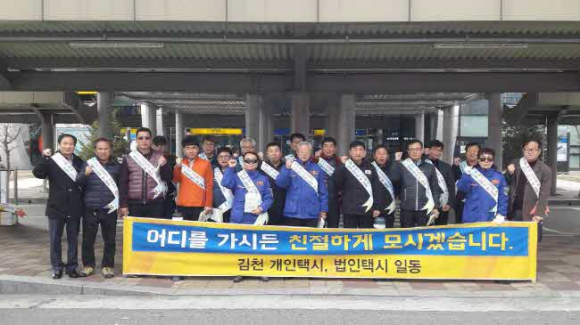 김천시 개인·법인택시 협의회에서는 지난 28일 오전 10시 회원 30여명이 참여한 가운데 택시승강장 4개소(KTX김천구미역, 김천시외버스정류장, 이마트, 김천역)를 순회하며 택시 서비스 향상 및 선진교통문화 정착을 위한 ‘택시 친절서비스다짐 캠페인’을 실시했다.