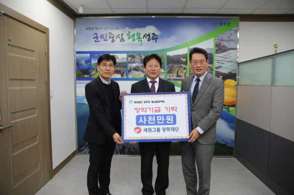 세원그룹(회장 김문기) 장학재단에서는 11월 28일(수) 오전 11시, 성주군청에서 성주군 이병환군수, 세원그룹 서재식 총괄사장이 참석한 가운데 (재)성주군별고을장학회에 4천만원의 장학금을 기탁했다.