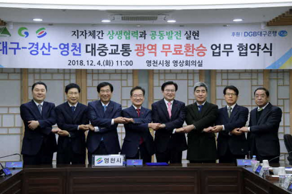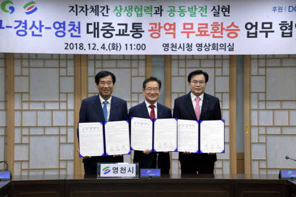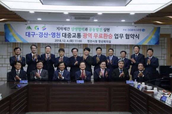 대구시(시장 권영진), 경산시(시장 최영조), 영천시(시장 최기문)는 4일 영천시청 영상회의실에서 세 개 시 공동으로 대중교통 광역 무료환승 추진 협약식을 갖고 대중교통 활성화와 지자체간 상생협력을 위한 상호협력 업무협약(MOU)을 체결했다.