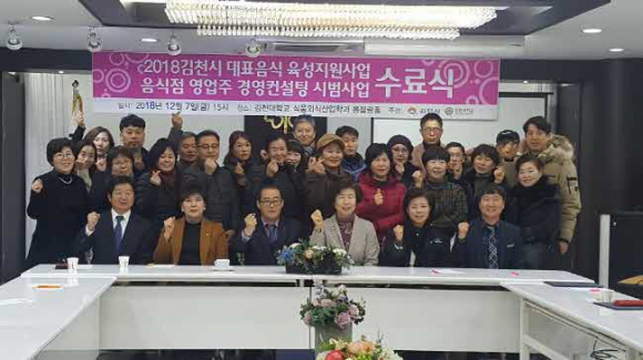 김천시는 12월 7일 오후3시 김천대학교 몽블랑홀에서 음식점 영업주 26명이 참석한 가운데 『김천시 대표음식 육성지원 및 음식점 영업주 경영컨설팅』수료식을 가졌다.