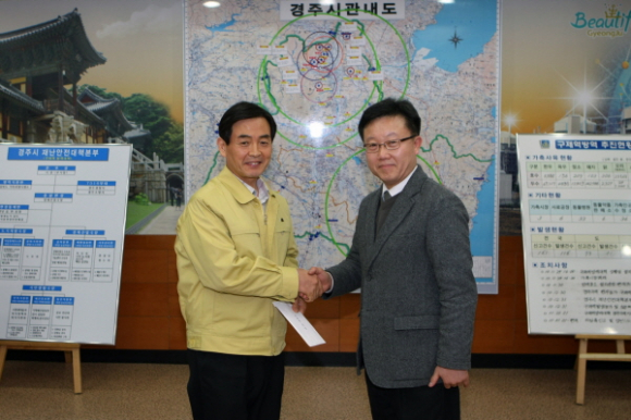 13일 오후 4시 '(주)더헤리티지.부산성' 박돈규 사장이 경주시청 재난대책본부 상황실을 방문해 구제역 위로 성금을 전달했다.