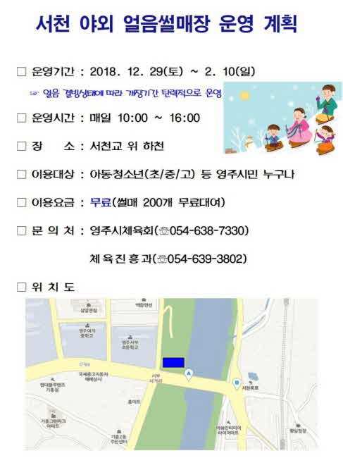 영주시는 겨울방학을 맞이해 오는 12월 29일부터 서천 야외 얼음썰매장을 개장해 시민들을 맞이한다.