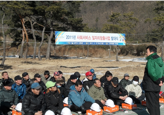 경주시는 17일 14시 경주시 동천동 헌덕왕릉 주차장에서 2011년 사회서비스 일자리창출 숲 가꾸기 사업 발대식을 가졌다. 이번 사업은 저소득층 및 청년 실업인 등을 산림사업에 투입하여 고용 창출과 지역경제 활성화에 기여하고자 하는데 큰 의의가 있다.