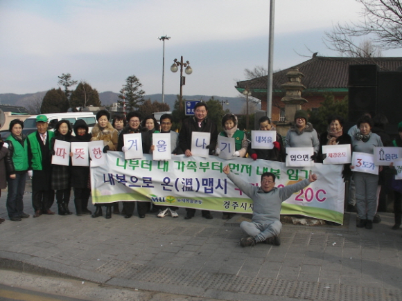경주시 새마을회(회장 임영식)는 2011년 1월 18일(화) 14:00 경주역 앞에서 겨울철 내복 입기 캠페인 및 에너지절약 캠페인을 전개했다.
