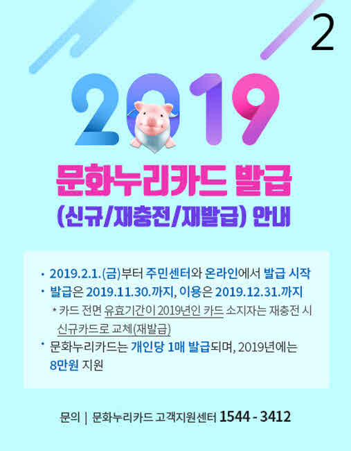 2019년 지원금액은 1인당 연 8만 원으로 전년 대비 1만 원 상향되어 이용자의 문화 향유 기회가 확대되며, 카드 발급 대상은 만 6세 이상(2013.12.31.이전 출생자)의 기초생활수급자 및 차상위 계층이다.