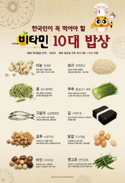 비타민 제작팀과 한영실 교수가 대한임상영양학회와 대한가정의학회의 자문을 얻어 선정한 ‘비타민 10대 밥상’은 한국인의 최대 관심사인 질병예방, 노화방지, 성장촉진 등 크게 3가지로 분류해 한국인의 식성에 맞는 식품들을 중심으로 소개하고 있다.
