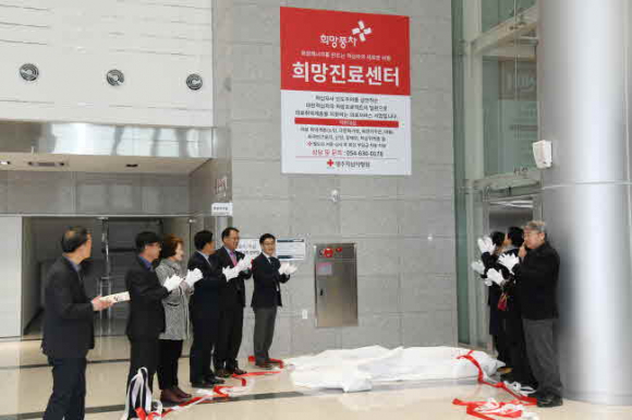 영주적십자병원은 지난 3월 15일(수) 오후 2시, 병원 내 앙리뒤낭홀에서 희망진료센터 개소식 및 현판식을 개최했다. 이날 개소식에서는 장욱현 영주시장, 이중호 영주시의회 의장, 이영호 영주시의원, 김인석 영주시보건소장, 황순금 대한적십자사 봉사회 영주시지구협의회장, 김석규 SK머티리얼즈 상생협력팀 부장 등 영주적십자병원 희망진료센터의 관계기관과 지역주민들이 참석해 ‘취약계층의 필수 의료보장’을 위한 희망진료센터 개소를 축하했다.