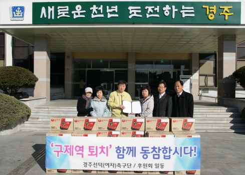 경주선덕여자축구단(단장 김종구)은 지난 1일 구제역·AI 상황실을 방문하여 관계자들을 위로하고 지역 구제역 초소에 지원을 바란다며 컵라면 40박스를 전달했다.