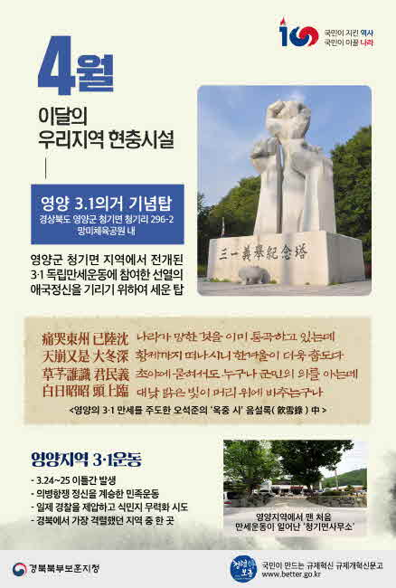 경북북부보훈지청(지청장 김상출)은 3․1절 100주년을 맞아 2019년 4월 이달의 우리지역 현충시설로 영양 3.1의거 기념탑(경북 영양군 청기면 청기리 296-2, 망미체육공원 내)를 선정한다고 밝혔다.