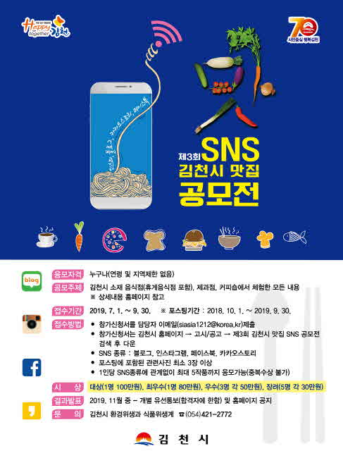 이번 공모전은 일반음식점 뿐만 아니라 카페, 제과점, 지역특산물 취급음식점 등 김천만의 맛과 멋을 향유할 수 있는 모든 음식(점)과 관련된 내용을 담은 SNS 수기가 대상이 되며, 응모자의 지역 및 연령 제한 없이 1인당 5점까지 2019. 7.1. ~ 9. 30까지 제출가능하며 수상자 선정은 심사위원 평가 및 네티즌 평가와 인지도 평가를 합산하여 대상 1명 100만원, 최우수 1명 80만원, 우수 3명 각 50만원, 장려 5명 각 30만원의 시상금이 주어진다.