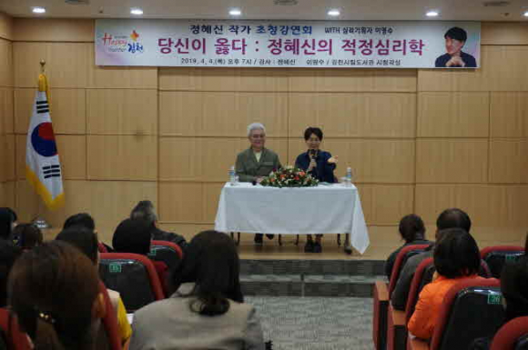 김천시립도서관은 4월 4일 오후 7시, 요즘 출판가의 핫이슈로 떠오르고 있는 베스트셀러 <당신이 옳다>의 저자인 정혜신과 심리기획자 이명수 작가를 초청하여 개최한 콜라보레이션 강연회가 참가시민에게 잔잔한 감동의 시간을 선사했다.
