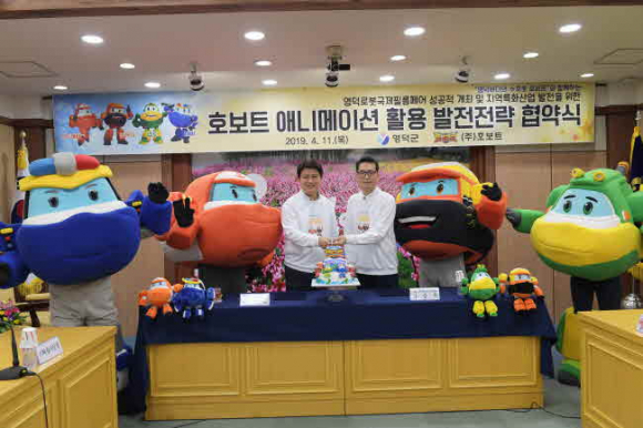 영덕군(군수 이희진)과 ㈜호보트(대표 이승욱)가 11일 오전 영덕군청 제1회의실에서 「제1회 영덕국제로봇필름페어」의 성공적 개최와 지역 문화콘텐츠 산업발전을 위한「호보트 애니메이션 활용 발전전략 협약식」을 개최했다.