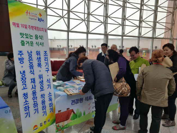 이날 김천시 환경위생과에서는『Happy together 김천 청결운동』과 연계하여 음식점의 ‘주방 대청소하기’ 실천의 사회적 분위기 조성을 위해 음식점 영업주에게 한 건의 식중독도 발생하지 않도록 동참한다는 서명운동을 전개하고, 리플릿 및 홍보물품을 제작⋅배부하여 영업주들의 큰 호응을 얻었다.