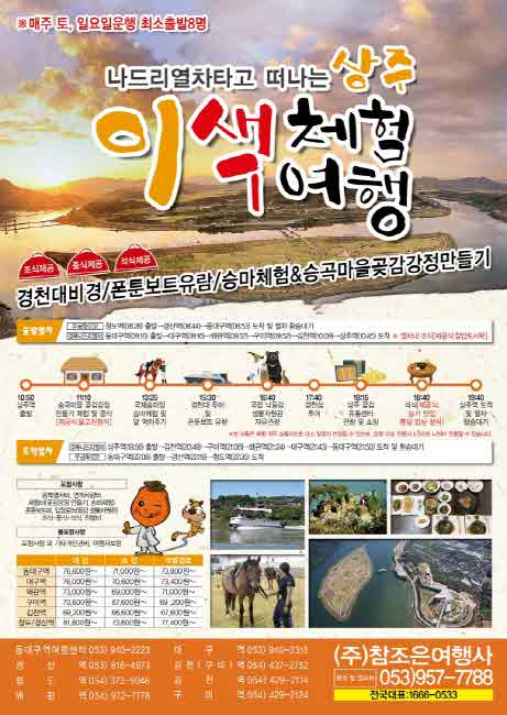 여행객들은 상주에 도착한 뒤, 낙동 승곡마을에서 곶감강정 만들기 체험과 푸짐한 ‘시골밥상’ 식사를 하고, 상주국제승마장으로 이동하여 승마와 말먹이(당근)주기 체험을 하게 된다. 또 인근에 위치한 낙동강 제1경 경천대 산책과, 폰툰보트를 타고 낙동강의 아름다운 자연 풍광을 즐긴 후 국립 낙동강 생물자원관과 경천섬을 둘러보고, 농가맛집 두락에서 ‘뽕잎밥상’으로 상주의 맛을 즐기는 것으로 일정을 마무리하게 된다.