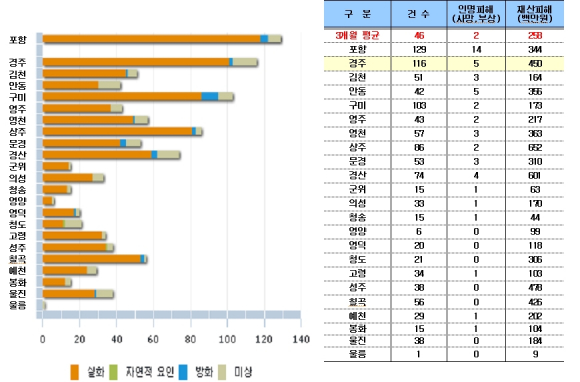 최근 3개월간(‘10년 11월~’11년 1월) 경주시의 화재발생건수는 총 116건으로 경북에서는 포항(129건) 다음으로 가장 많이 발생했으며, 인구대비 발생건수로는 경북에서 가장 높은 것으로 나타났다.