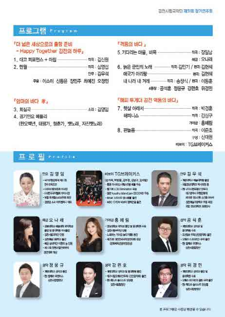 마지막 3부 ‘Happy together 김천, 역동의 바다’에서는 ‘해피니스’ 등의 곡을 국악단원의 가야금 연주로 풀이하며, 뒤이어 국악 관현악 ‘판놀음’에 맞춰 국악단 타악팀과 TG브레이커스 비보이 단의 협연으로 마무리한다.