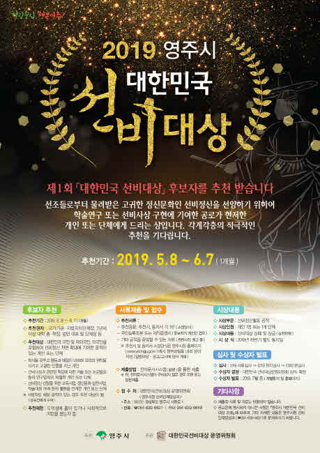 경북 영주시(시장 장욱현)는 선조들로부터 물려받은 고귀한 정신문화인 선비정신을 선양하기 위해 ‘제1회 대한민국 선비대상’ 후보자를 공모한다.