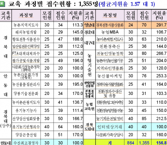 금년도 지원율이 크게 증가한 것은 경북농민사관학교가 전국적인 농어업인 교육모델로 채택되고 농어업인 교육을 수요자 중심의 맞춤형으로 다양한 교육과정을 편성했다.