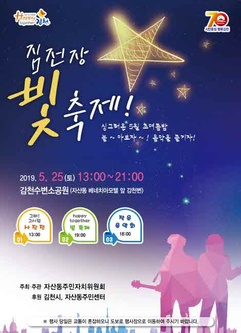 자산동(동장 김경희)은 오는 25일 자산동에 위치한 감천수변 소공원에서 ‘싱그러운 5월의 초여름밤, 빛과 음악의 어울림’을 주제로 「Happy together 짐전장 빛 축제」를 개최한다.