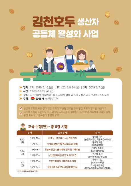 이번 김천호두생산자공동체활성화사업은 김천시에서 추진하는 「김천시호두클러스터조성사업」의 일환으로 각 분야의 성공한 전문가의 강의를 통해 관내 호두생산자들의 역량강화는 물론 김천호두의 판로 개선 및 유통 활성화를 모색하는 자리로 기획됐다.