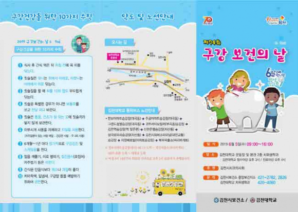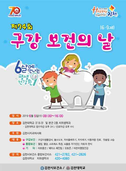 김천시는 6월 5일 오전 9시부터 오후4시까지 김천대학교 운동장에서 제74회 구강보건의 날을 맞아 ‘건강한 치아 건강한 인생’이란 주제로 김천시보건소, 김천대학교, 김천시치과의사회와 합동으로 구강보건의 날 기념행사를 운영할 계획이다.