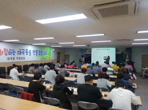 대곡동에서는 5월 23일(목) 오후 2시 경, 대곡동 주민을 대상으로『Happy together 김천운동』의 세부실천 방안 중 친절교육을 실시하였다. 특히 관내 단체, 통장, 직원 등 친절의 중요도가 비교적 크고, 파급효과가 다소 높은 직업군은 필수로 참석케 하여 효율성을 높였다.