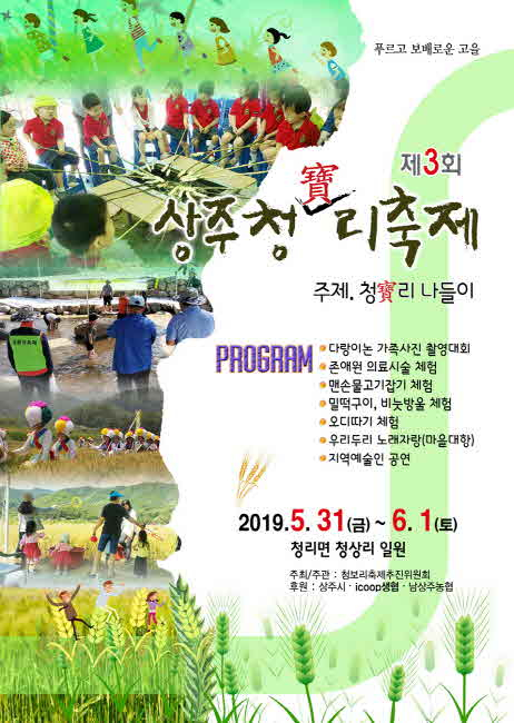 ‘푸르고 보배로운 고을’인 청리면(면장 이신우)은 청보리축제추진위원회(위원장 강희종) 주관으로 5. 31.(금) ~ 6. 1.(토) 양일간에 걸쳐 청상리 일원에서『제3회 상주 청寶리축제』를 개최한다.