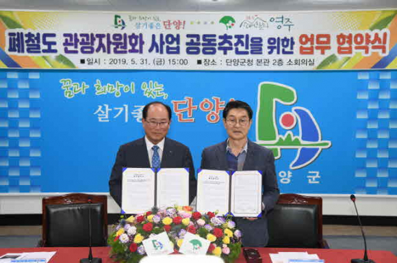 영주시는 지난 5월 31일(금) 단양군청 회의실에서 장욱현 시장과 류한우 단양군수 등 관계자들이 참여한 가운데 「폐철도 관광자원화사업」 공동추진을 위한 업무협약을 체결했다.