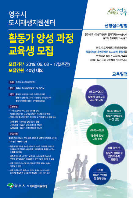 교육은 7월부터 영주시 도시재생지원센터(영주로 189번길 11)에서 매주 수요일 18:30분부터 2~3시간 총 8주의 교육과정으로 진행될 예정이다.