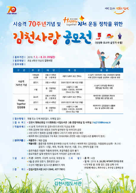 응모할 작품의 주제는 김천시민으로서의 자긍심 표현, 미래 김천에 대한 희망과 진취적 발전방안 및 아이디어 공유, 시민모두가 행복한 도시를 만들어 나가기 위한 제언 등이며‘Happy together 김천운동’의 7대 목표와 70대 과제를 참고하여 작성하면 된다. 응모작의 접수는 오는 7월 2일부터 8월 23일까지 시립도서관 종합자료실 또는 이메일로 제출하면 되고, 상상화는 도화지 4절지 또는 캔버스에 그림으로, 글짓기는 200자 원고지 5매 이상 자필로, 수필은 A4 용지 2~3매 내외로 자필 또는 워드프로세서로 작성하면 된다.