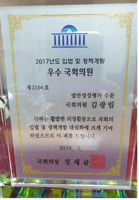 2018년 대한민국 국정감사 우수의원에 이어 2019년에는 의정대상 수상