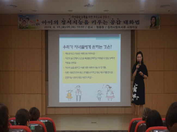 시 승격 70주년을 맞은 김천시가 시민모두가 행복한 도시를 만들어 나아가기 위해 추진하고 있는 Happy together 김천운동이 사회의 최소단위인 가정에서부터 튼튼하게 뿌리내릴 수 있도록 하는 데에 기여하고자 지난 6월 25일부터 이틀간 부모와 자녀와의 정서적소통기법을 소개하는 부모교육 강좌를 시립도서관에서 개최하여 참가시민들의 큰 호응을 받았다.
