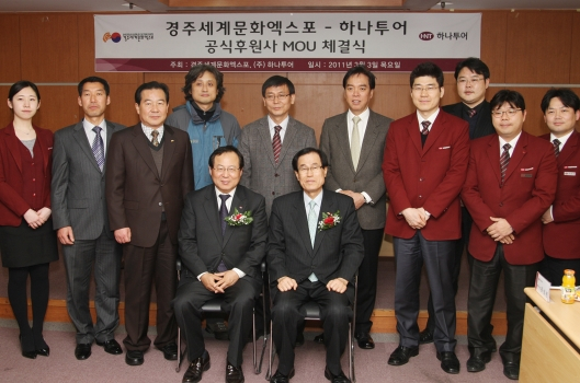 서울 하나투어 본사에서 열린 이 협약식에는 경주엑스포 정강정 사무총장, 도남탁 대외협력실장, 이상원 운영팀장과 하나투어 권희석 대표, 신승철 글로벌전략본부 상무, 김석헌 신성장사업부 본부장 등 관계자 20여명이 참석했다. 이 협약으로 경주엑스포는 하나투어에 2011경주세계문화엑스포 명칭 및 휘장 사용권을 제공하고 예매권 판매 권한을 부여한다. 또 엑스포 행사 진행시 해외 항공권 구매는 하나투어를 우선적으로 이용하게 된다.