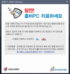 아울러, 정부는 인터넷 이용자들이 자신의 PC가 좀비PC가 될 경우 자동 PC파괴 프로그램이 작동하므로 반드시 안철수 연구소 전용백신 등을 다운받아 PC를 점검 치료해 줄 것을 당부했다.