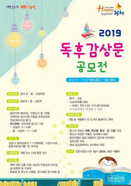 김천시는 시승격 70주년을 맞이하여 자라나는 청소년들에게 책의 소중함을 일깨우고 독서생활화를 정착시키고자「독후감상문 공모전」을 개최한다.