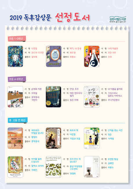 응모 부문은 초등부와 중·고등부로 나뉘며, 선정도서는 초등 저학년 3권, 초등 고학년 3권, 중·고등 6권으로 모두 12권이며, 선정도서목록은 시립도서관 홈페이지에서 확인할 수 있다.