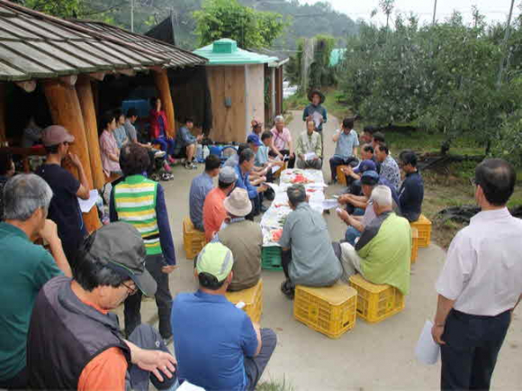김천시(시장 김충섭)는 지난 7월 15일 농소면 수연꿈농장(대표 신수호)에서 사과대학 2·3기 연구회원 50여명이 참석한 가운데 여름철 사과밭 관리를 위한 현장교육을 실시했다.