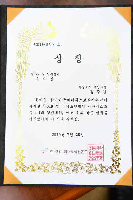 김천시(시장 김충섭)는 7월 25일 세종시 고려대학교 세종캠퍼스에서 사)한국 매니페스토실천본부와 대전세종연구원에서 주최하는 ‘(10회) 2019 전국 기초자치단체장 매니페스토 우수사례 경진대회’에서 ‘일자리·경제’분야에서 우수상을 수상했다.