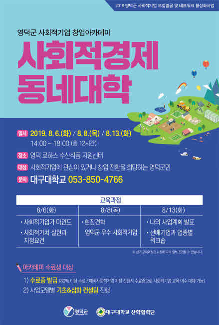 영덕군과 대구대학교 산학협력단(단장 박세현)은 오는 8월 6일 영덕 로하스수산식품센터 대회의실에서 사회적기업의 창업 및 전환을 돕기 위한 “사회적기업 창업아케데미 사회적경제 동네대학”을 개강한다고 밝혔다.