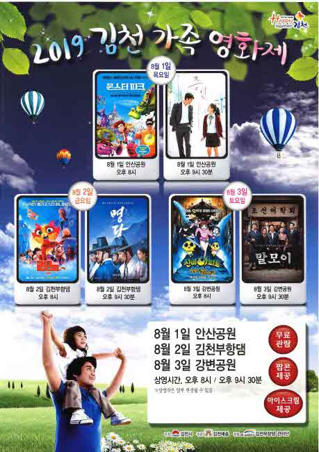3일간 열리는 ‘2019 김천가족영화제’는 영화를 사랑하는 시민 누구나 무료로 관람할 수 있으며 시민들이 영화를 즐기며 열대야를 날리는 자리를 만들고자 김천시에서 주최하고 (사)한국예총 김천지회 주관으로 실시된다.