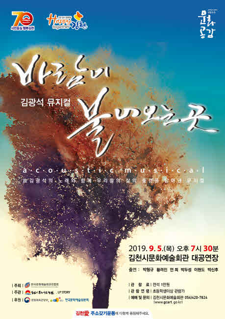 김천시문화예술회관(관장 김금숙)에서는 세월이 지나도 세대를 뛰어넘어 사랑받는 가수 김광석의 뮤지컬 ‘바람이 불어오는 곳’을 오는 9월 5일(목) 오후 7시 30분 문화예술회관 대공연장에서 개최한다.