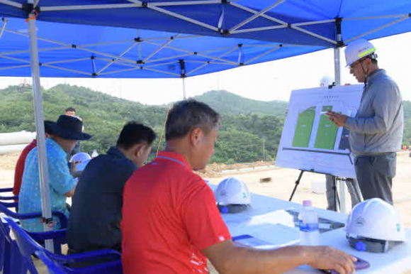 이희진 영덕군수는 지난 14일 영덕군축구협회 관계자들과 함께 공사현장에서 시공사로부터 현재 공정 및 향후계획에 대한 설명을 듣고 시설 이용자들의 편의와 안전을 위하여 그늘시설과 이동로에 대한 적절한 방안 검토를 당부했다. |