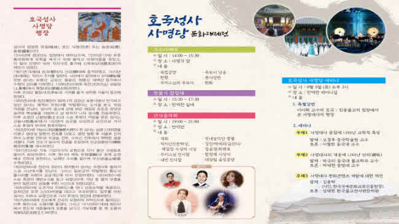 이날 호국성사 사명당 문화대제전은 추모다례재(오후 2시~3시 30분 사명각 앞), 찬불가합창제(오후 3시 30분~5시 30분 만덕전 실내), 산사음악회(오후 6시 30분~9시 만덕전 앞)로 나눠 진행된다.