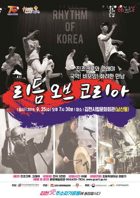 김천시문화예술회관(관장 김금숙)에서는 국악과 비보이를 테마로 모든 연령층의 관객에게 재미와 감동을 선사할 기획공연 ‘리듬 오브 코리아’를 오는 9월 25일(수) 오후 7시 30분 김천시립문화회관(남산동)에서 개최한다.